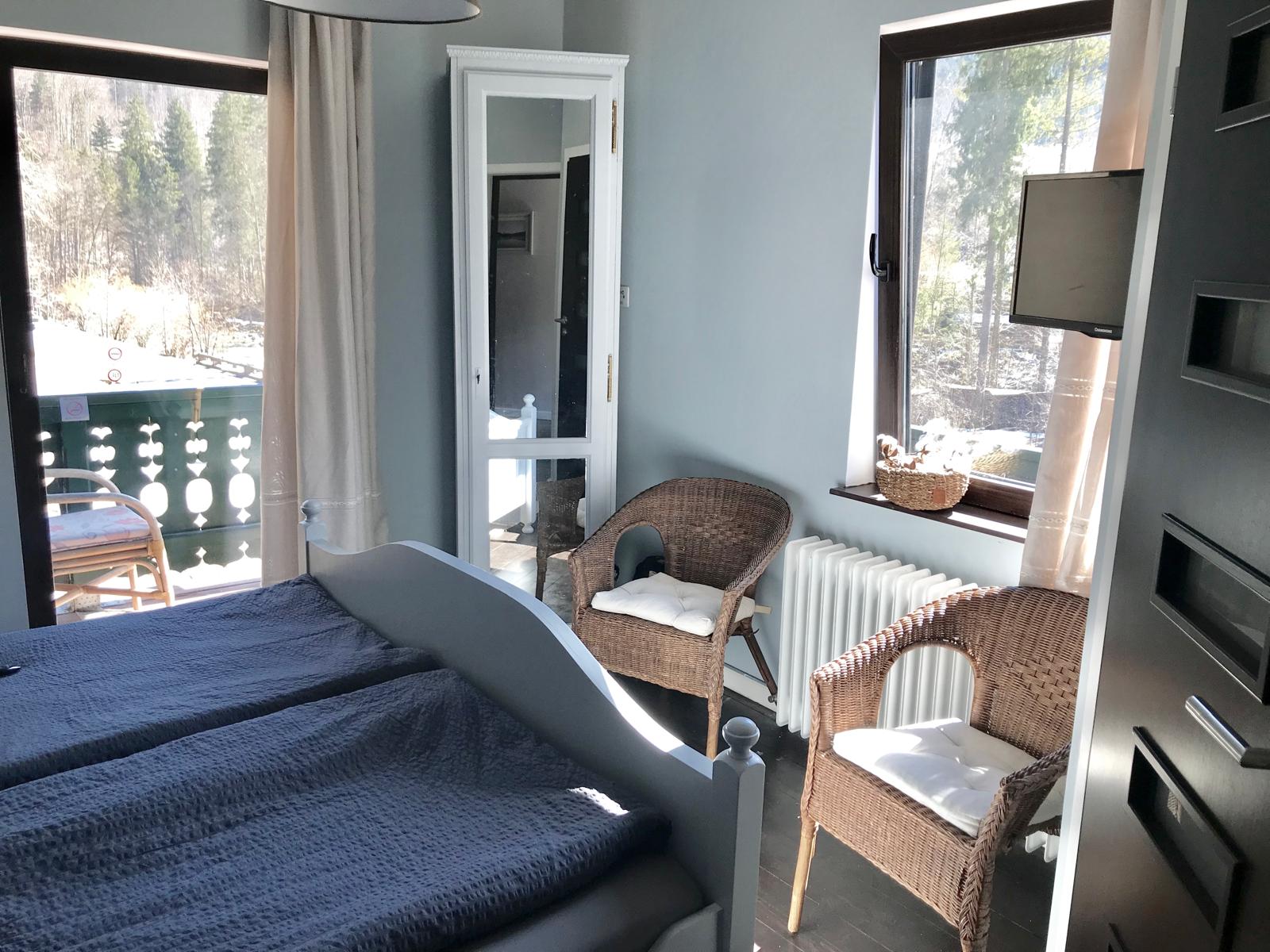 Kleines gemütliches Zimmer mit Doppelbett. Im Zimmer gibt es einen Holzfußboden mit einem warmen Teppich aus Naturwolle. Bilder mit Blumen oder Alpenlandschaften schaffen eine entspannte Atmosphäre.
